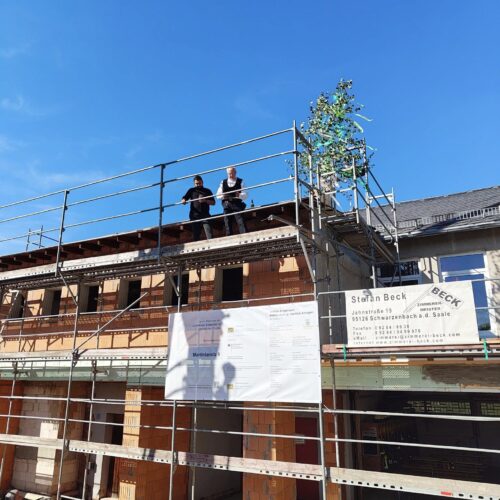 Unser Vorstand und auch Zimmermanns-Meister Stefan Beck befestigt den Richtkranz am Dachfirst und hält den traditionellen Richtspruch, um Segen und Glück für das Haus und seine Bewohner zu erbitten. Anschließend gab es das traditionelle Scherbenwerfen.